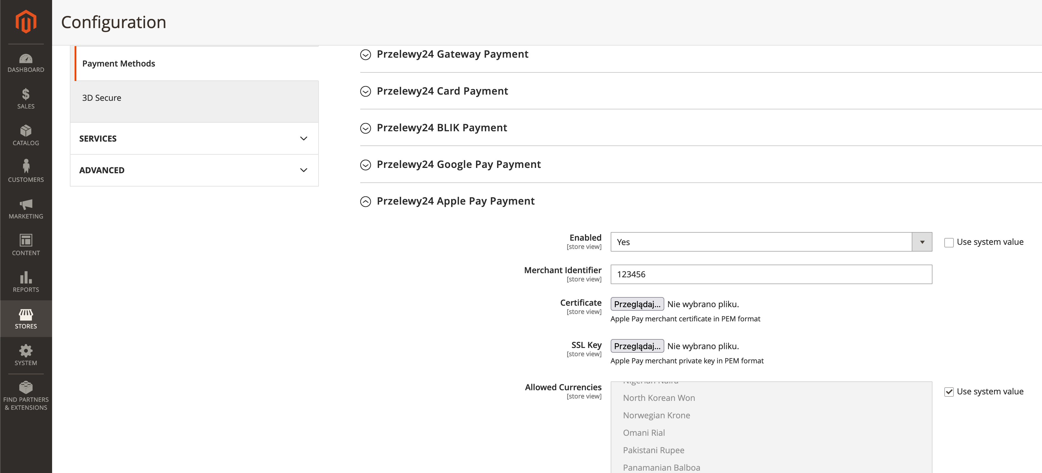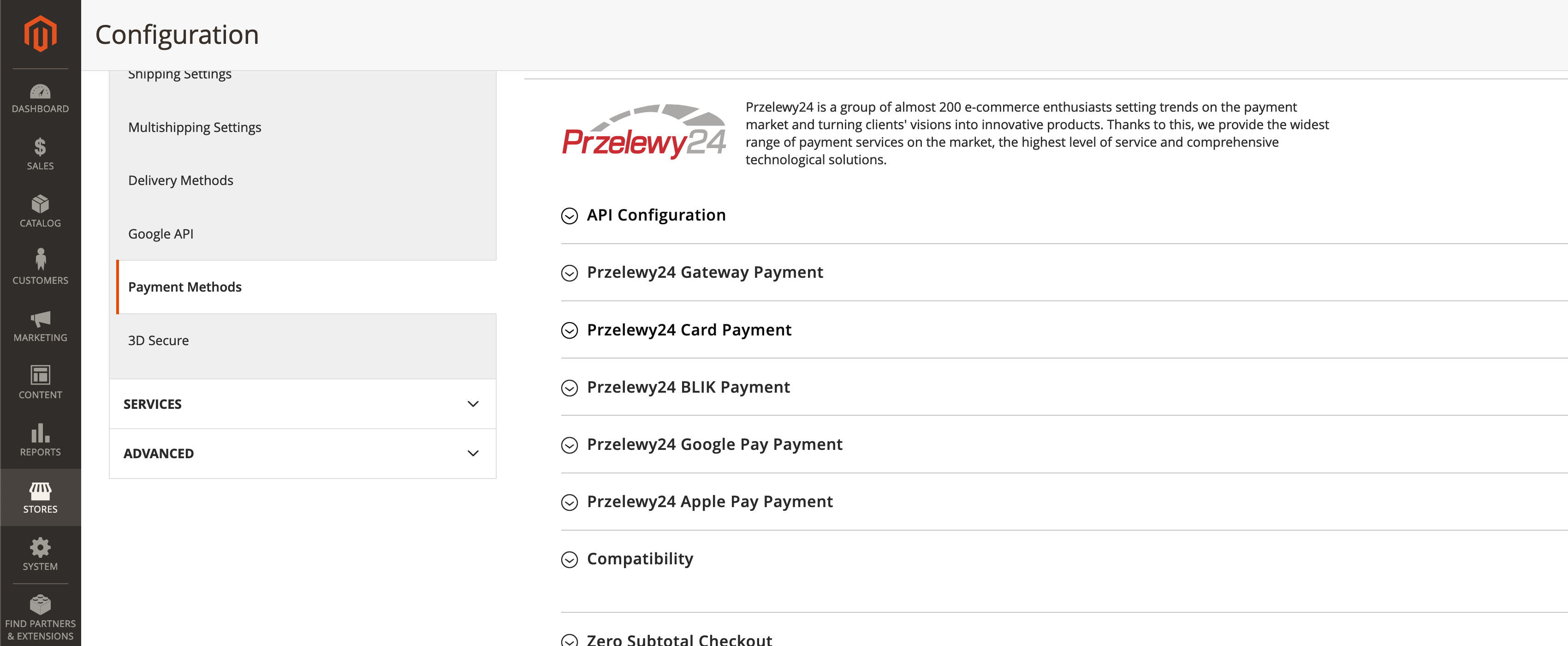W panelu admina magento przechodzimy do: Stores -> Configuration -> Sales -> Payments Methods